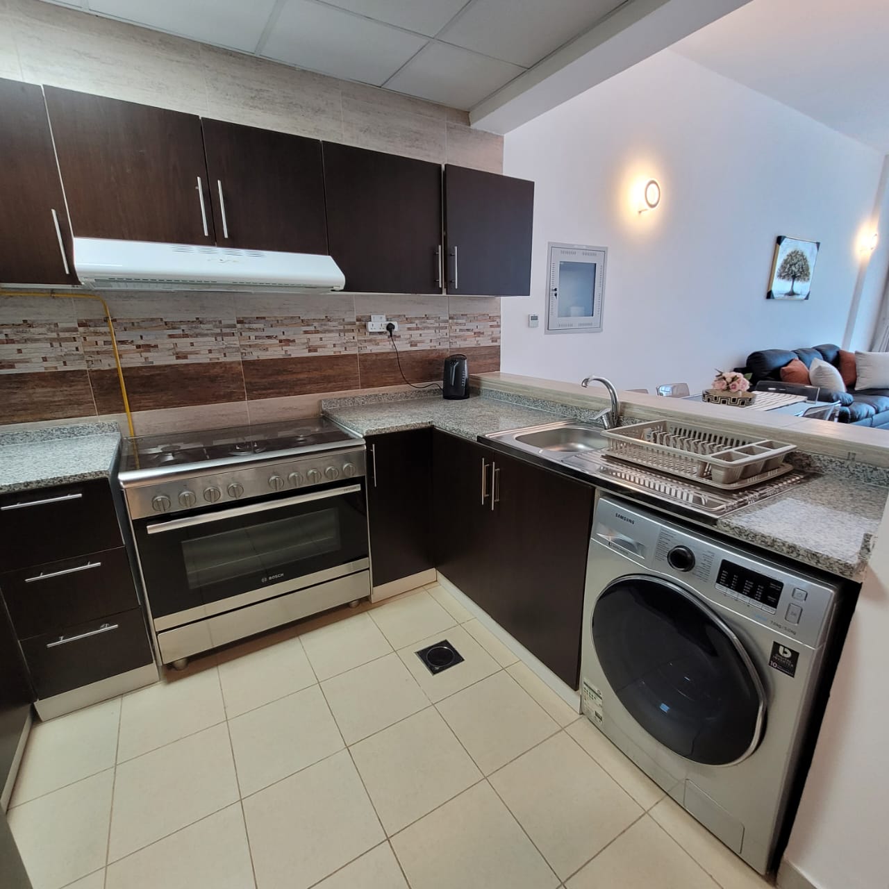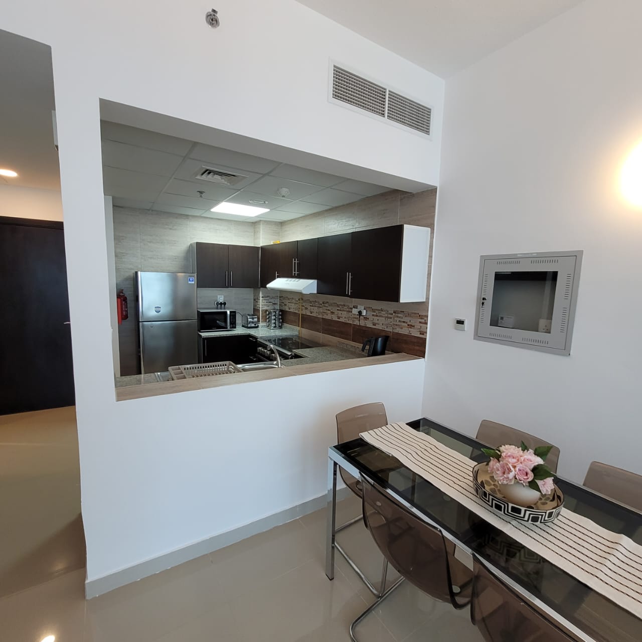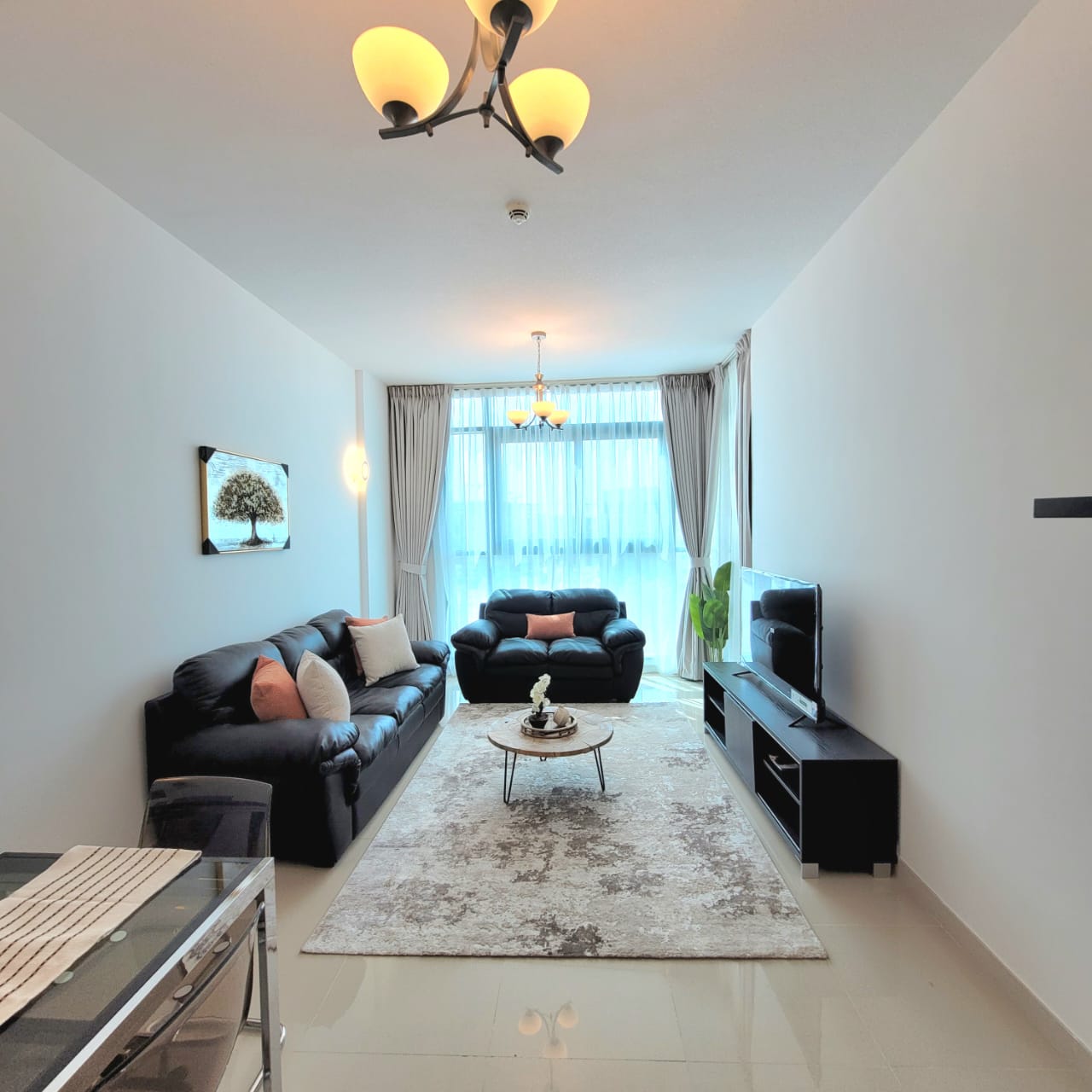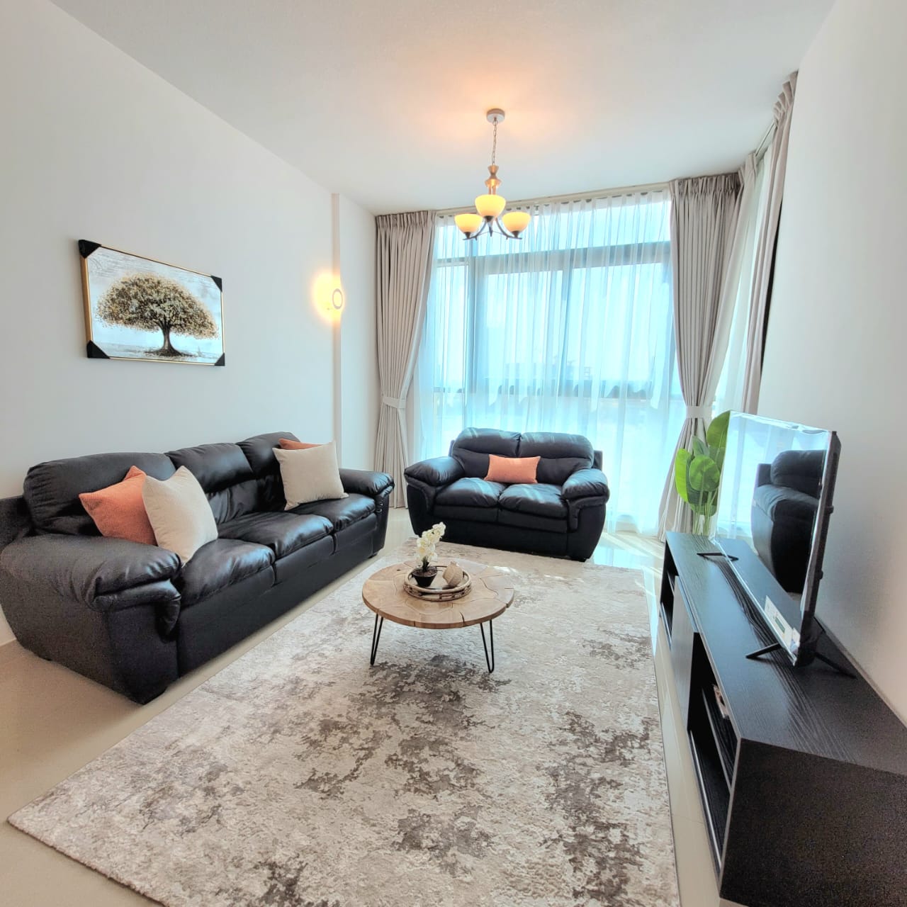 The apartment features a bright living area with stylish furnishings, a well-sized bedroom with ample storage, and a modern kitchen equipped with quality appliances. The bathroom is finished to a high standard, and the layout is designed to maximize space and natural light.