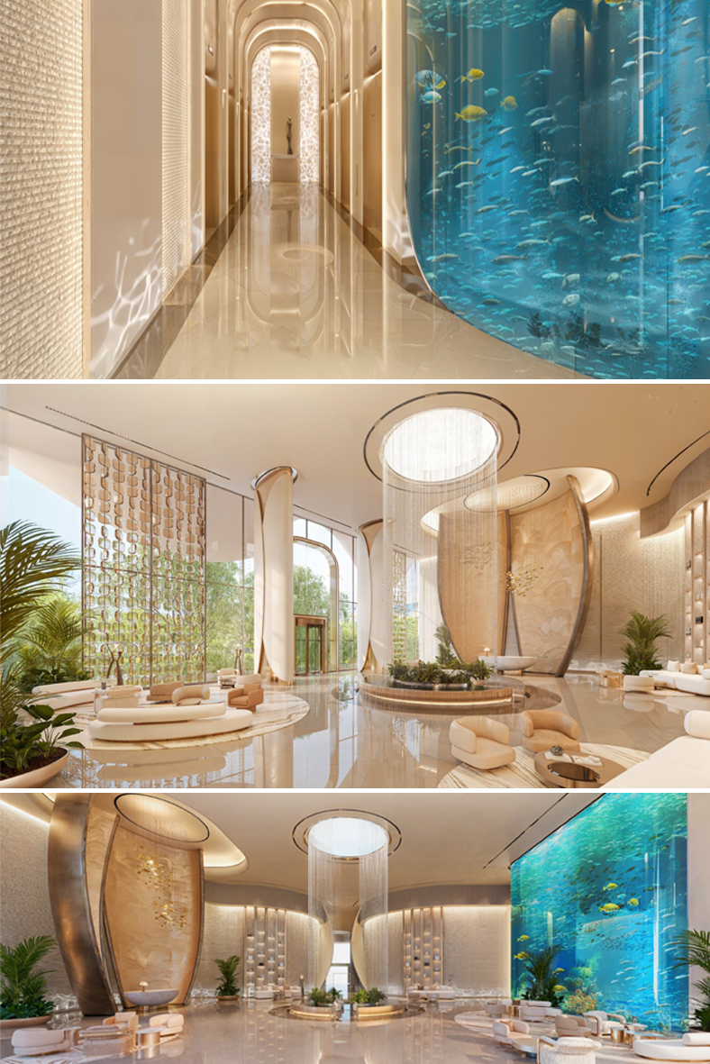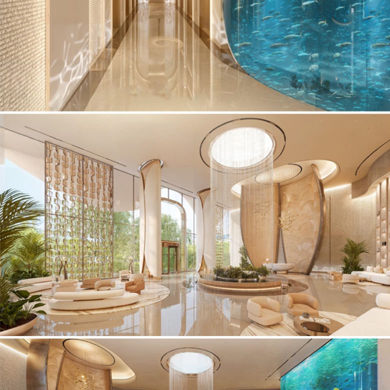 Grand hotel-inspired lobby, infinity pools, private beach access, wellness facilities, and premium concierge services.